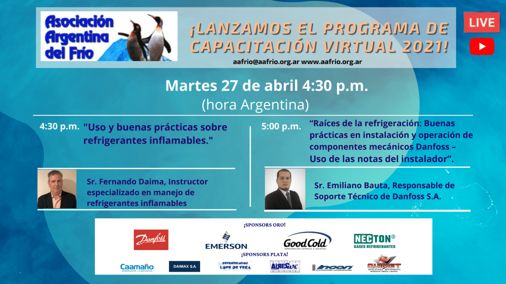 Dada la situación actual, debido a la pandemia del covid-19, durante la primera mitad de este año la Asociación Argentina del Frio continuará con su Programa de Capacitación Virtual transmitiendo charlas técnicas y conferencias para llegar a todos nuestros Socios y amigos.