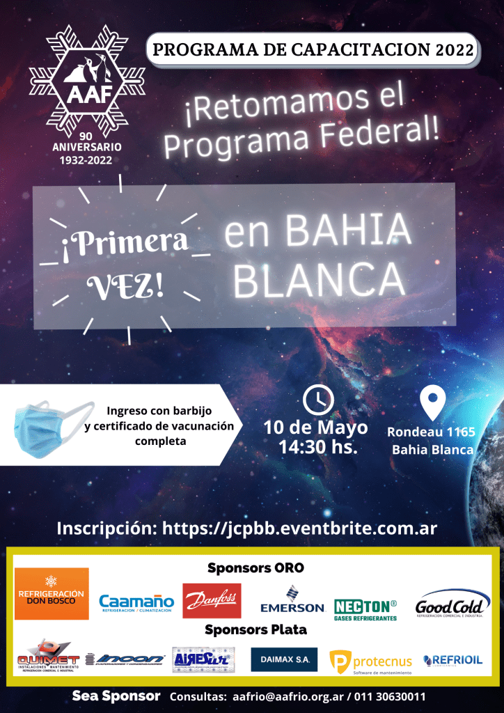 La Asociación Argentina del Frío realizará una Jornada de Capacitación en la Ciudad de Bahía Blanca el próximo mes. Este será el segundo evento del 2022 en el cual la Asociación está festejando sus 90 años y están previstos otros en Rosario, Córdoba y el Congreso CATAAR.