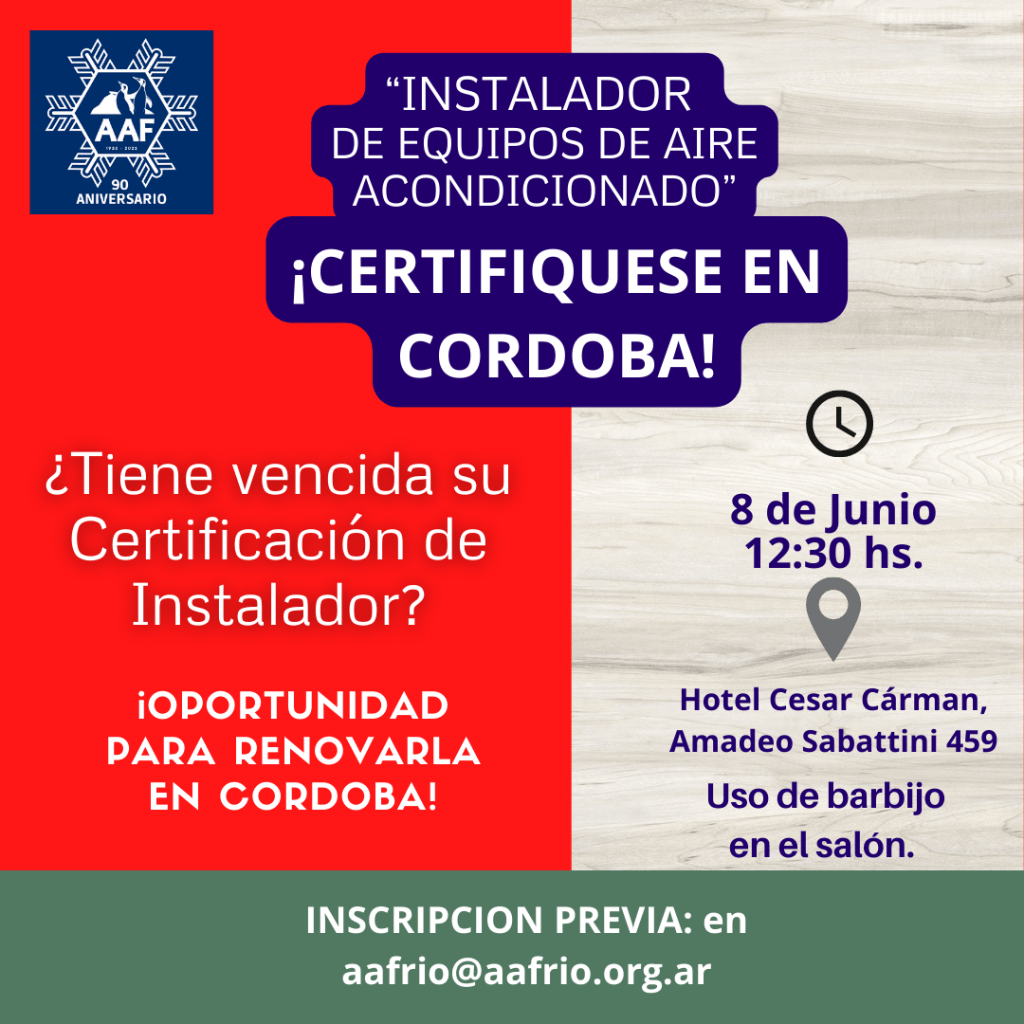 La Asociación Argentina del Frio fijó una nueva fecha para rendir el examen de Certificación de Instalador de Equipos de Aire Acondicionado o para renovar la credenciales vencidas el 8 de junio a las 12:30 hs. en el Hotel César Cárman, Amadeo Sabattini 459, Córdoba.