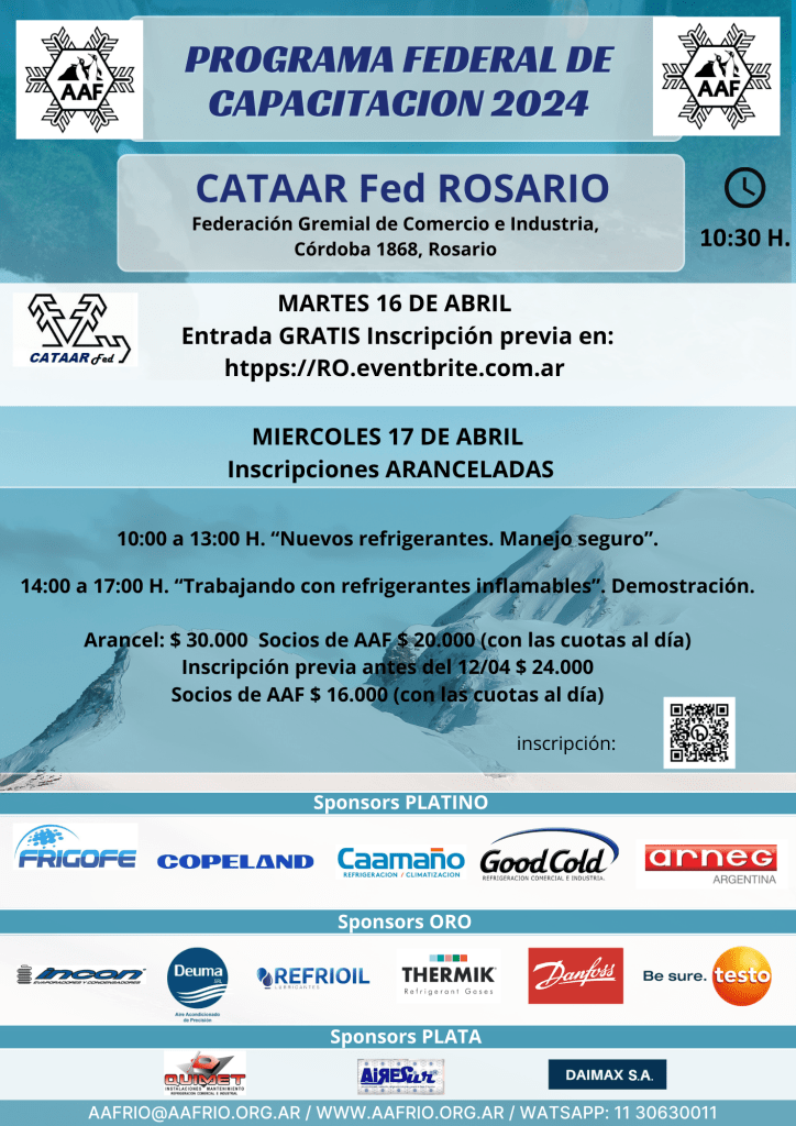 La Asociación Argentina del Frio organizó para el CATAAR Fed ROSARIO un programa de charlas con inscripción GRATIS el día 16 de abril en la Federación Gremial de Comercio e Industria de Rosario, Cordoba 1868.