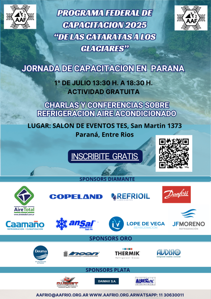 La Asociación Argentina del Frio se complace en incluir en el Programa Federal de Capacitación 2025 «De las Cataratas a los Glaciares» a la Ciudad de Paraná, Entre Ríos el 1º de julio a las 13:30 hs. en el salón de eventos TES, San Martin 1373, Paraná.