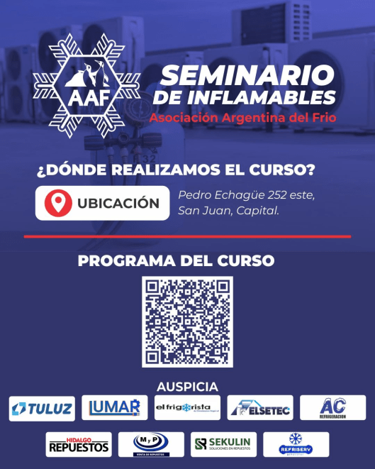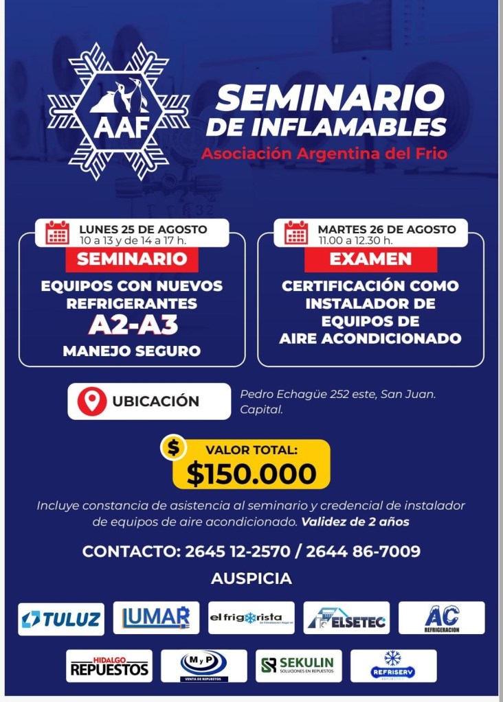 La Asociación Argentina del Frio estará dictando el curso sobre Nuevos Refrigerantes A2 y A3. Manejo seguro, el 25 de agosto en San Juan y el 26 tomará examen a los que quieran certificarse como Instalador de Equipos de Aire Acondicionado.