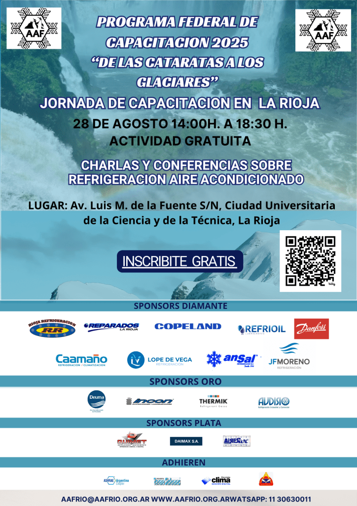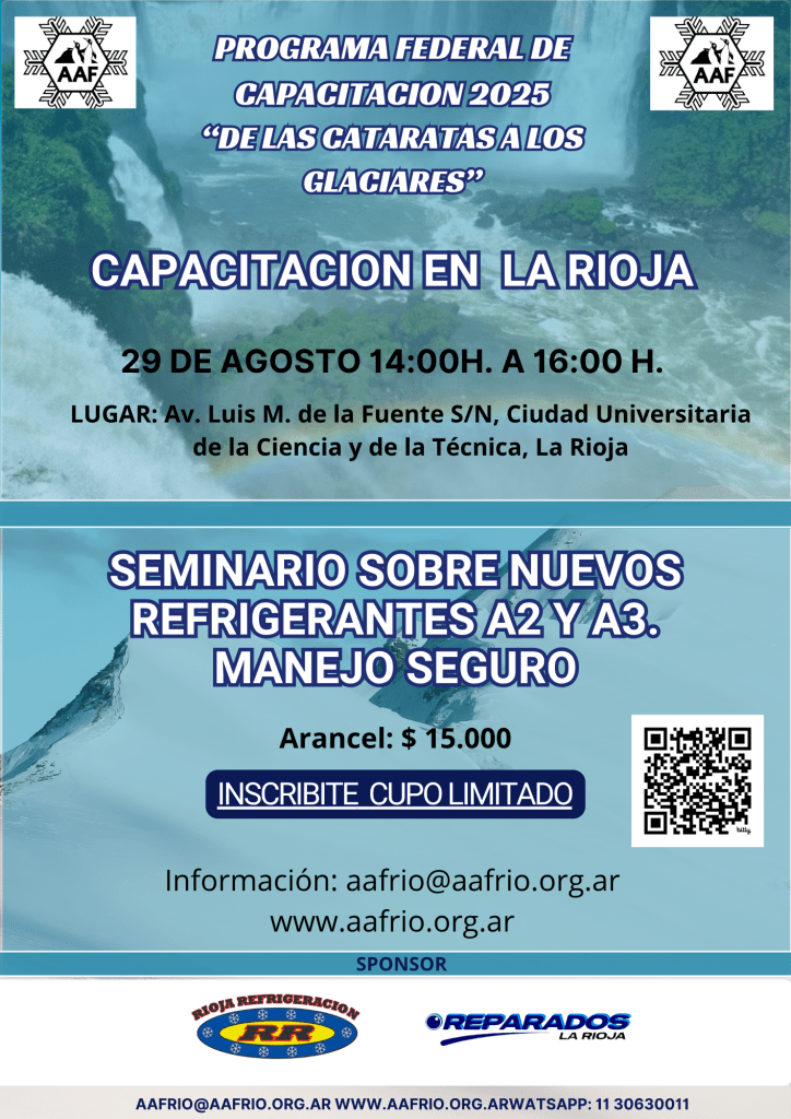 La Rioja fue incluida en el Programa Federal de Capacitación 2025 «De las Cataratas a los Glaciares». Esperamos encontrarnos con los profesionales del rubro los días 28 y 29 de agosto con un programa de charlas y seminario sobre Nuevos refrigerantes A2 y A3. Manejo seguro.